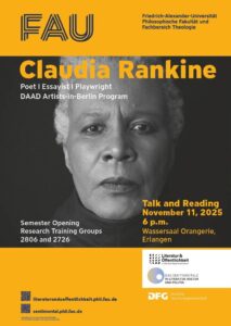 On November 11, renowned U.S. poet, essayist, and playwright Claudia Rankine will join us for a reading and talk at Orangerie, Erlangen at 6 pm.